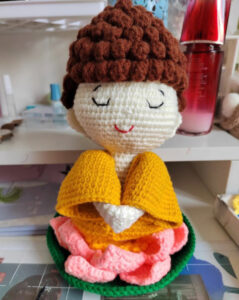 This handcrafted crochet amigurumi doll features Buddha seated gracefully upon a lotus flower, embodying peace and tranquility. Crafted with care from high-quality COTTON YARN, this doll measures approximately 14 centimeters (5.5 inches) in height.