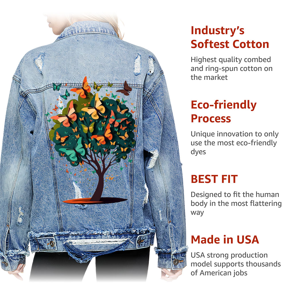 Butterfly Tree Women’s Oversized Denim Jacket – Cute Design Ladies Denim Jacket – Illustration Denim Jacket