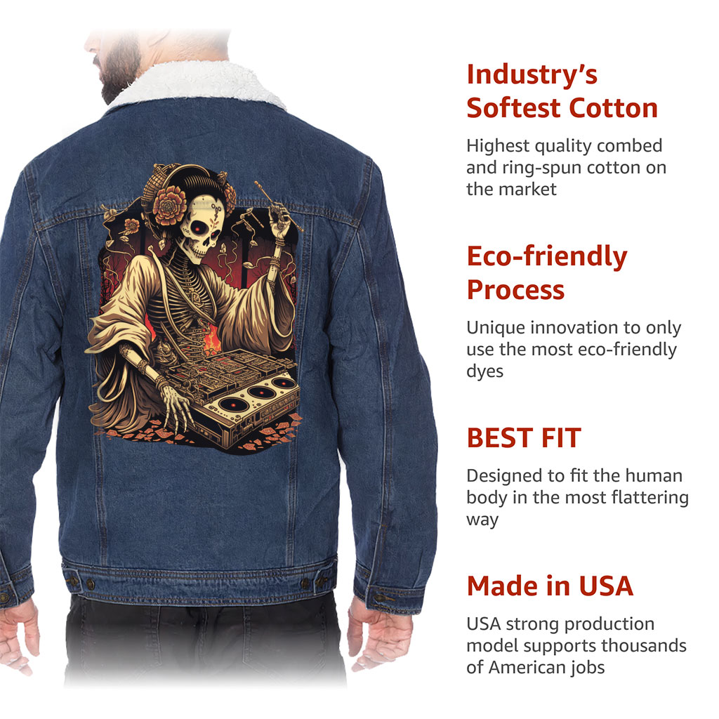 Cool DJ Men’s Sherpa-Lined Denim Jacket – Skeleton Graphic Denim Jacket – Illustration Jacket for Men