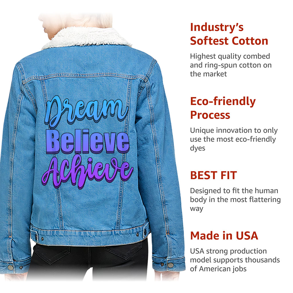 Dream Believe Achieve Women’s Sherpa Denim Jacket – Inspirational Ladies Denim Jacket – Graphic Denim Jacket