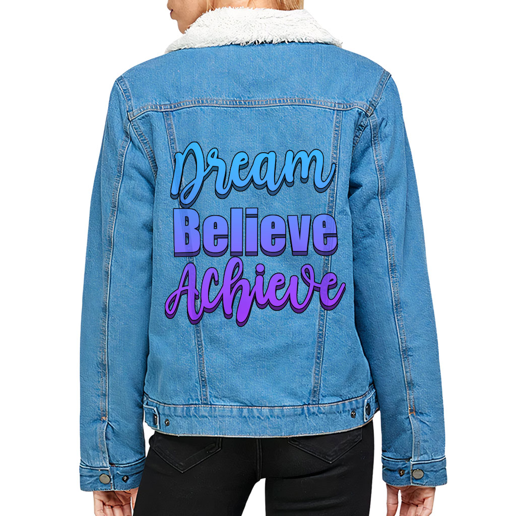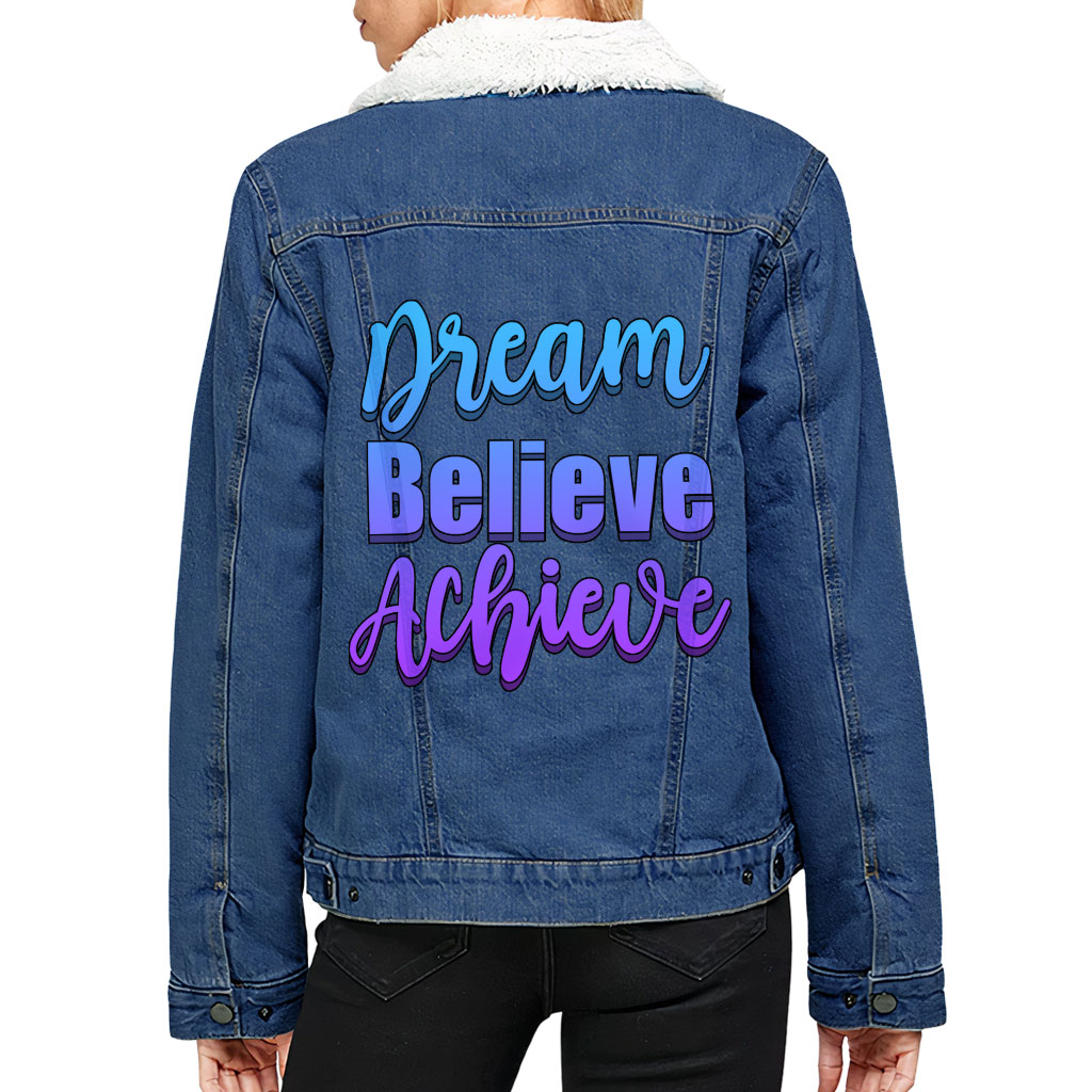 Dream Believe Achieve Women’s Sherpa Denim Jacket – Inspirational Ladies Denim Jacket – Graphic Denim Jacket
