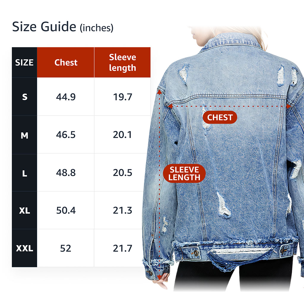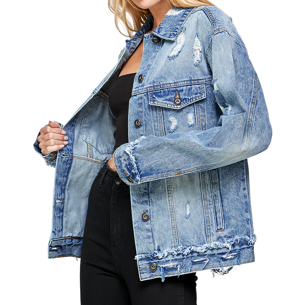 Sun and Moon Ladies Denim Jacket is light enough to wear on a cool day but roomy enough to layer it with a sweatshirt. The ripped distressed frayed denim jacket is a basic to add to your fall wardrobe.