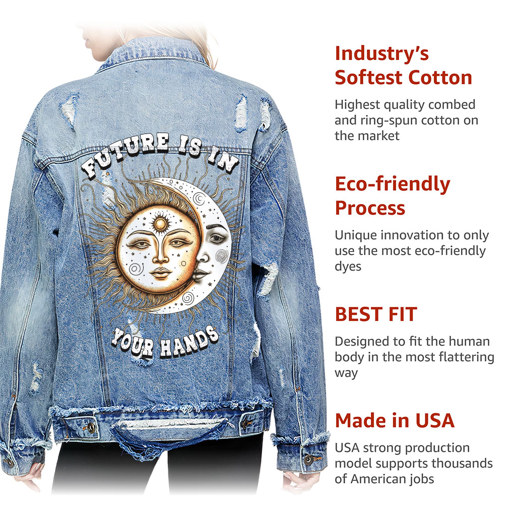Future is in Your Hands Women’s Oversized Denim Jacket – Sun and Moon Ladies Denim Jacket – Trendy Denim Jacket