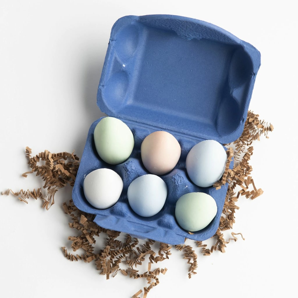 Safe, non-toxic, washable chalk eggs are made from all-natural materials: chalks and natural pigments packed in cardboard carton.