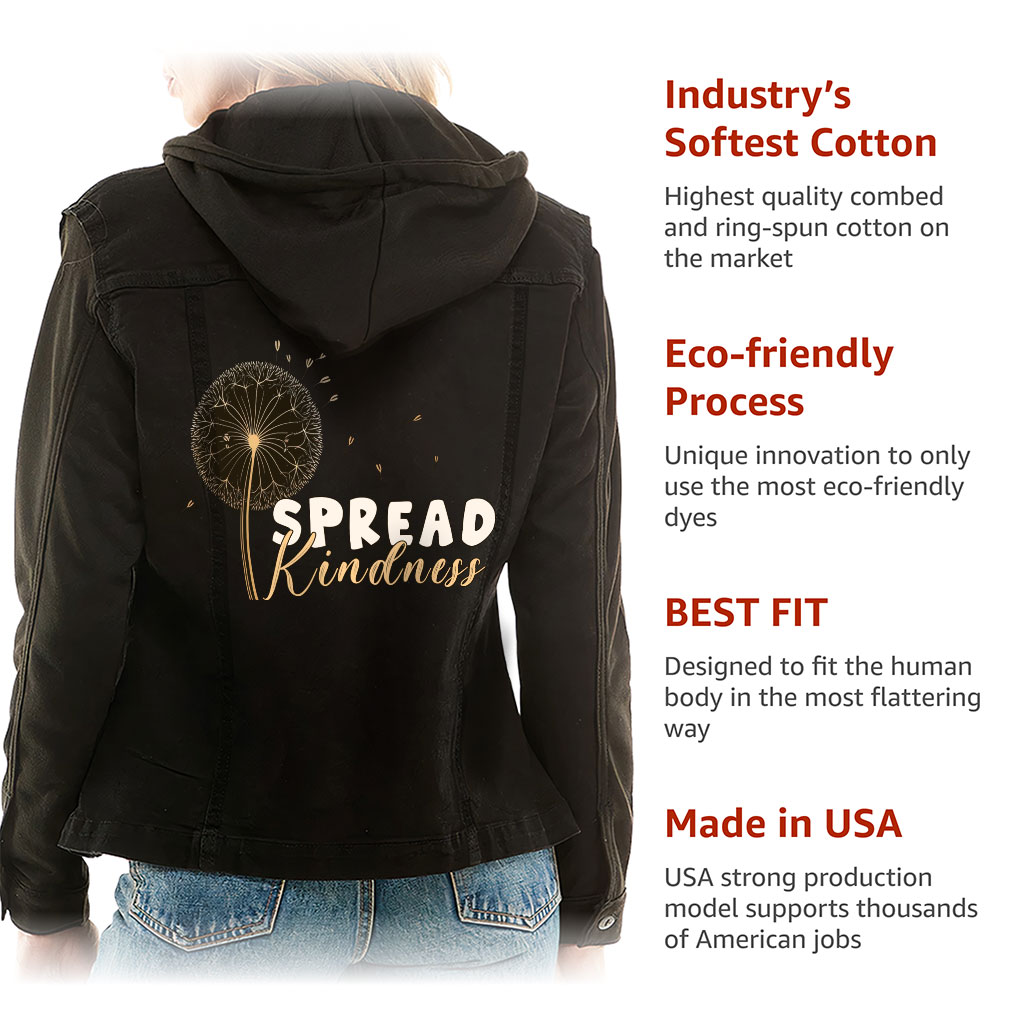 Spread Kindness Ladies Denim Jacket with Fleece Hoodie – Dandelion Women’s Denim Jacket – Positive Denim Jacket