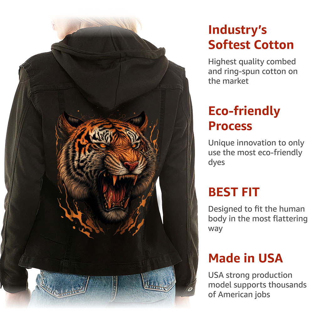 Tiger Face Ladies Denim Jacket with Fleece Hoodie – Printed Women’s Denim Jacket – Wild Animal Denim Jacket