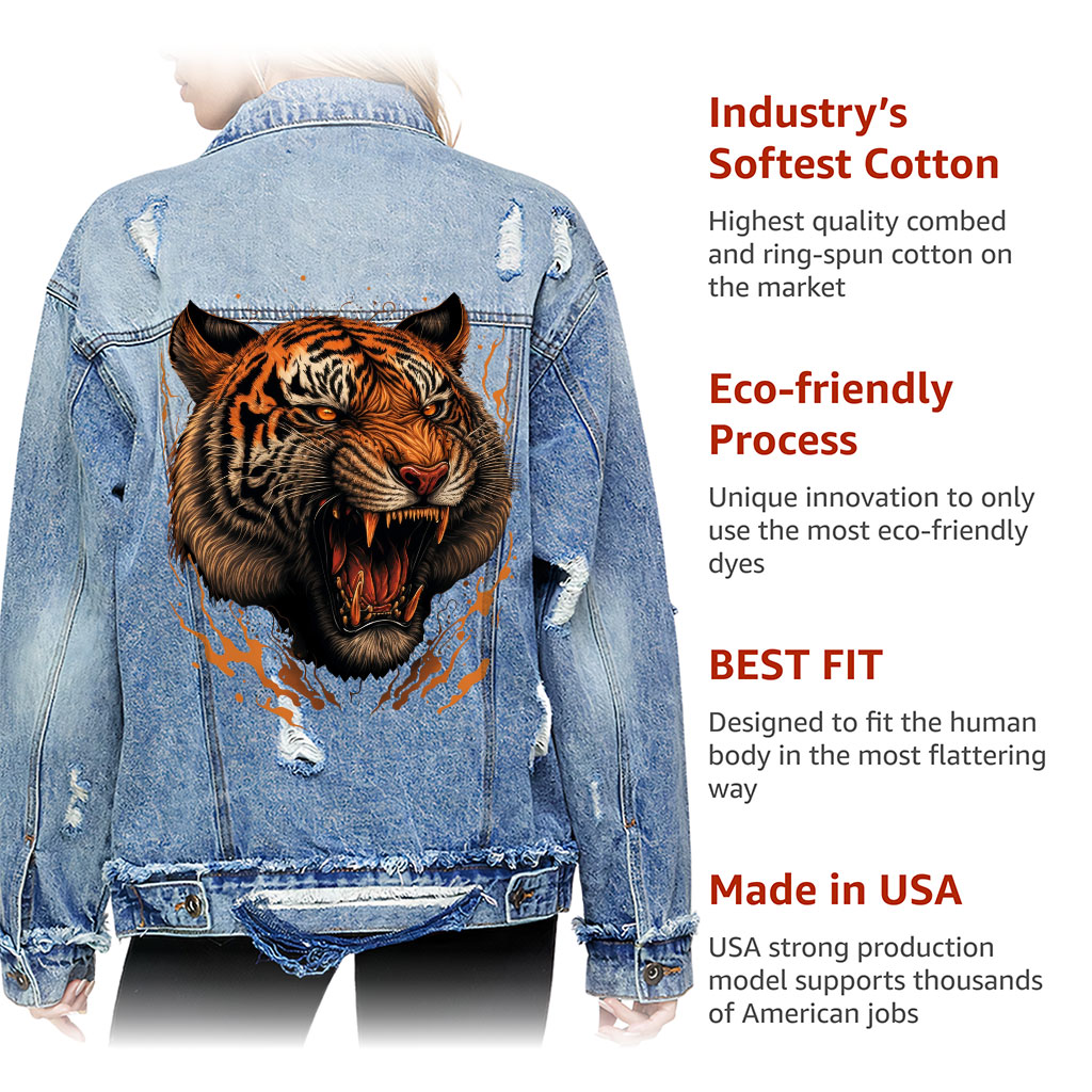 Tiger Face Women’s Oversized Denim Jacket  It’s time to get wild and unleash your inner rebel with Printed Ladies Denim Jacket! This jacket is oversized for a super cozy fit that is comfortable to wear yet still fashionable. Crafted from premium 100% cotton, this denim jacket is designed in California…