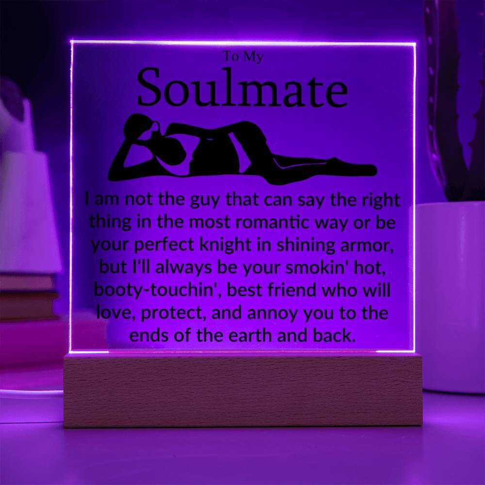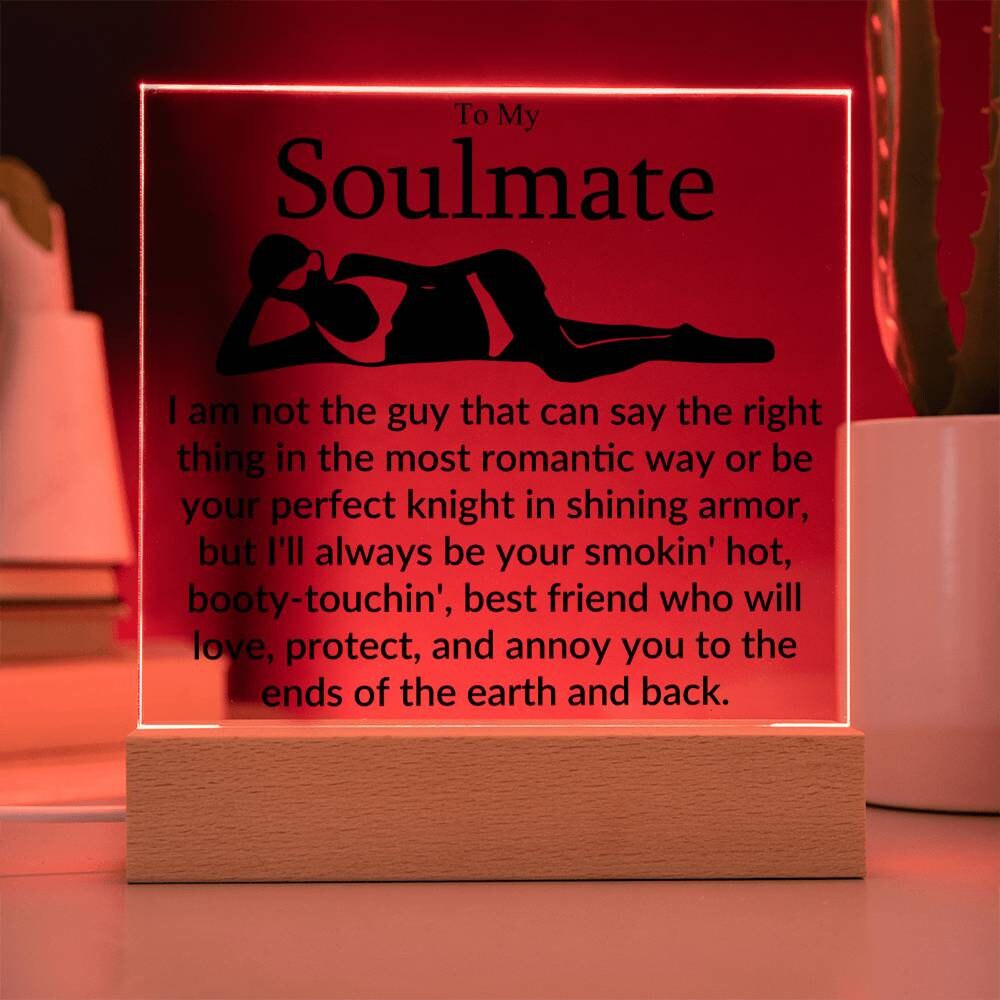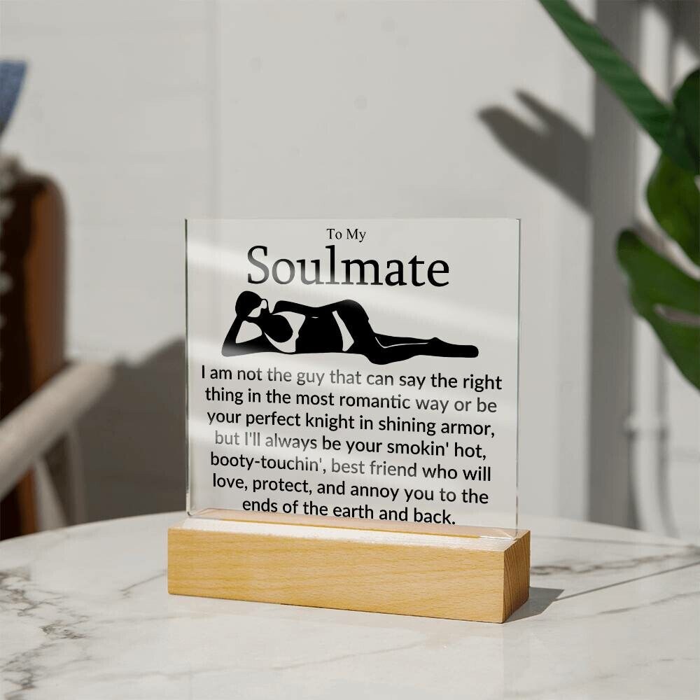 Exclusive Square Acrylic Plaque: To My Soulmate! – I am not the guy that can say the right thing in the most romantic way or be your perfect knight in shining armor, but I’ll always be your smokin’ hot, booty-touchin’, best friend who will love, protect, and annoy you to the ends of the earth and back.
