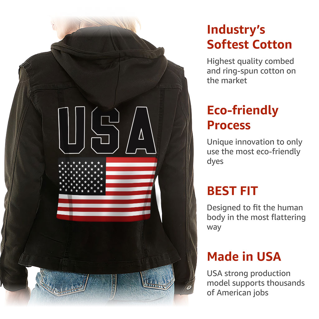 USA Flag Ladies Denim Jacket with Fleece Hoodie – Cool Women’s Denim Jacket – Patriotic Design Denim Jacket